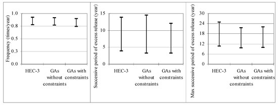 Figure 6 and Figure 7 delineate the appraisal interims of water shortage characteristics for the simulation approach utilizing genetic algorithms (GAs) with and without the smoothing function constraint, as well as the HEC-3 simulation approach. These figures illustrate that the proposed procedure yields fewer water shortage characteristics, counting shorter durations and smaller magnitudes of water shortages, when compared to the existing approach. This shows that the GAs-based simulation with the smoothing function constraint successfully reduces the effect of relationships in water shortage situations. Furthermore, the figures outline that the water shortage characteristics obtained with and without the smoothing constraint do not show critical contrasts. In Figure 8 and Figure 9, the insights of excess releases are presented for the three sets of rules. It is clear that both GAs-based simulation techniques do not result in greater excess releases compared to the existing approach [73]. These discoveries demonstrate that the optimization process utilizing GAs keeps a sensible level of control over excess discharges while still accomplishing advancements in tending to water shortage situations.