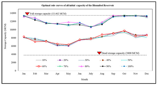 Optimal rule curves of all objective functions (the Bhumibol Reservoir) [48].