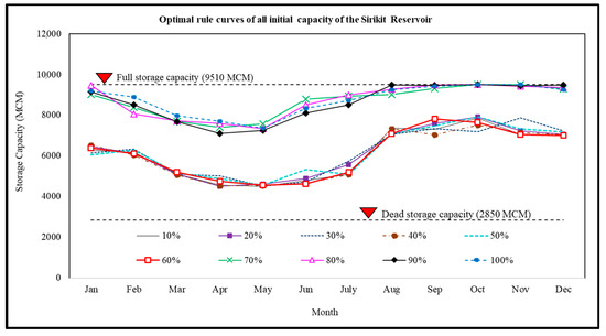 Optimal rule curves of all objective functions (the Sirikit Reservoir) [48].