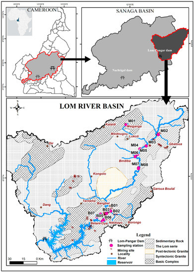 Surface water accounts for a small percentage (0.26%) of the world’s freshwater and represents an essential natural resource for human life and activities [1]. It is therefore essential to preserve the good ecological status for sources of freshwater [2]. However, demographic growth and increasing needs emphasize the pressures on the water resource [1], making it more sensitive to pollutants from various natural and anthropogenic sources [2]. Among the pressures on surface water, artisanal and small-scale gold mining (AGSM) is of particular importance [3,4]. Small-scale gold mining has been practiced for centuries around the world. It is a source of economic development and livelihood for people in many developing countries in sub-Saharan Africa, Asia, South America and Oceania [5]. In the eastern Cameroon region, the Lom River and its tributaries drain the Lom gold-bearing catchment, where gold mining has been practiced in an artisanal manner since the 1950s [6] and been semi-mechanized since the boom of extractive industries in Africa in the 2000s. This period was characterized by the arrival of foreign mining companies (mainly Chinese) equipped with modern machinery [7]. Semi-mechanized mining is more efficient than artisanal mining because it uses machinery such as excavators, shovels, washing units and dredges. This type of mining is mainly used for shallow deposits that are less than 20 m deep [8]. There are nearly one hundred semi-mechanized open-pit mines in the eastern region, which had a production of approximately 318 kg of gold in 2019 [9]. Gold mining is the source of many environmental, social and health problems, which include the use of mercury and environmental contamination [10]. Indeed, mercury emissions from gold mining represents nearly 38% of the total global emissions [11]. In this type of exploitation, mercury is often used to extract the gold ore from the gangue by amalgamation; the UNEP [12] estimates that it takes 1 to 2 g of mercury to process 1 g of gold. Mercury is used in the ore extraction process as it facilitates the recovery of fine gold particles. After extraction and crushing, the ore is treated by adding mercury to form an amalgam of equal proportions of Hg and gold, which is then heated (400–500 °C) to preserve the spongy gold and evaporate the Hg (Smith, 2019; Kosai et al., 2023). Mercury is thus released into the environment (atmosphere, soil, water) at different stages of processing; the World Gold Council [13] estimates that 5 to 45% of the mercury used is directly released in its elementary form into rivers.