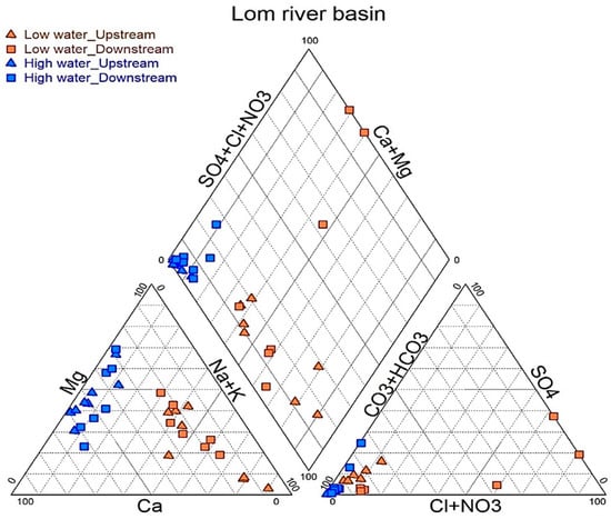 The projection of the water composition in the Piper diagram [70] led to a hydrochemical classification of the analyzed waters as well as their spatiotemporal evolution (Figure 2). During the low-water period and in the upstream part of the basin, the waters are of the bicarbonate–calcic and magnesian type at 62.5% against 37.5% for the bicarbonate–sodium and potassium types. Downstream of the watershed, the waters are divided into three types: chloride–sulfate–calcic and magnesian at 42.86%, bicarbonate–sodic–potassic at 42.86% and bicarbonate–calcic–magnesian at 14.28%. During the high-water period, the hydrochemical classes of the waters evolved, changing to be 100% the calcic–bicarbonate type in the upstream sector. In the downstream sector, the waters changed from the three previous types to two types: bicarbonate–calcic–magnesian at 57.14% and bicarbonate–calcic at 42.86%.