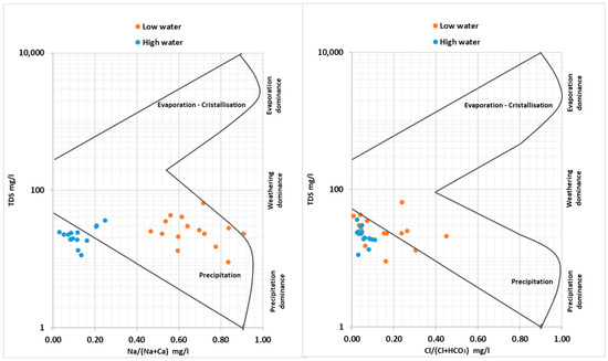 Gibbs [72] identifies atmospheric precipitations, rock weathering and evaporation–crystallization processes as the three main natural mechanisms controlling worldwide surface water chemistry. He set up a diagram depicting the weight ratio of Na/(Na + Ca) versus cations and Cl/(Cl + HCO3) versus TDS to determine the origins of dissolved geochemical constituents.
