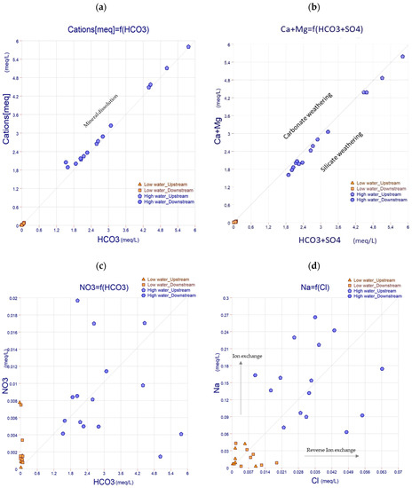 Different processes can occur during the rock–water interactions. The plot of total cations versus alkalinity (Figure 4a) indicates that mineral dissolution is the primary process controlling the chemistry of the studied waters. Furthermore, in the scatter plot of (Ca + Mg) versus (HCO3 + SO4), the majority (80%) of samples fall below the theoretical equilibrium line (Figure 4b). This result suggests that silicate weathering is the main source of ions [75], especially since the bedrock is composed of primary silicate minerals. Mimba et al. [35] suggest that silicate hydrolysis (plagioclases and feldspars) by the slightly acidic water of the basin is at the origin of the dissolved cations. The scattering of samples (negative and non-significant correlation) in Figure 4c eliminates the probability that nitrate derives from nitrification during the degradation of organic matter. In which case the generation of nitrate would consume the alkalinity [76]. Finally, the dispersion of Na as a function of Cl (Figure 4d) indicates that atmospheric inputs are not the only source of sodium in the analyzed waters and that sodium is also derived from cation exchange [73].