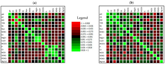 To properly identify the relationships between the variables for each season, two Pearson correlation matrices were produced, one for the low-water period (Figure 5a) and one for the high-water period (Figure 5b). The matrices show very strong (0.7 < r < 1), strong (0.5 < r < 0.7) and acceptable (0.3 < r < 0.5) positive (+) or negative (−) correlation coefficients between some variables (TDS–EC, K+–Na+, Ca2+–Mg2+, SO42−–F− and Hg–TSS).