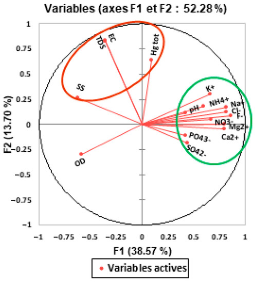 During the low-water period, the Pearson correlation matrix shows (i) very strong positive correlations between TDS and EC, SO42− and F−, K+ and Na+, Ca2+ and Mg2+, and b NO3−, Cl− and F−; (ii) strong positive correlations between DO and alkaline earth metals (Mg2+ and Ca2+), NO3− and SO42−, Ca2+ and Na+, and Hg, TSS and EC; and finally, (iii) a strongly negative correlation was found between dissolved oxygen (DO) and dissolved solids and conductivity (TDS and EC). During the high-water period, the matrix shows (i) very strong positive correlations between TDS and EC, K+ and TSS, and DO and pH; (ii) a strong positive correlation between Ca2+, pH and DO; and (iii) an acceptable correlation between Hg and TSS.