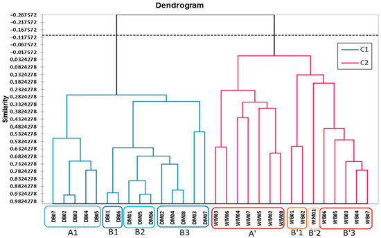 Pearson’s correlation matrix (CM) was used to assess the relationship between the 17 measured variables [47]. Principal component analysis (PCA) was used to identify homogeneous groups of variables within the principal factors to determine their possible origins as sources of pollution in the analyzed waters [48]. Finally, hierarchical cluster analysis (HCA) was used to explore the similarities between different sampling stations to better differentiate the likely pollution sources based on their locations, sampling periods and/or types of activity [22]. All these analyses were performed with XLSTAT (2022) software (https://www.xlstat.com/fr, accessed on 2 September 2022).