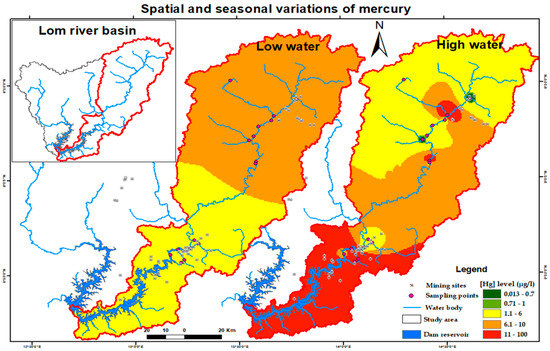 The spatial distribution of mercury in the Lom basin was performed by interpolation between different measured concentrations at river points using an inverse distance weighting (IDW) method in the ArcGIS 10.8 software. The IDW spatial analysis tool considers that the influence of the plotted variable (mercury content) decreases with distance from the sampled location [57].