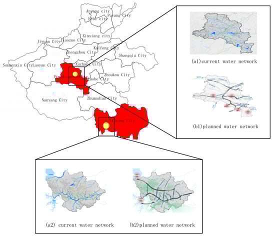 In recent years, Xinyang City and Pingdingshan City have been pioneers in water network construction in Henan Province. To better utilize the ecological foundation of the region, which features abundant mountains, waters, and greenery, and achieve high-quality development, Xinyang City has been dedicated to building a sustainable ecological water network based on the interlacing rivers, canals, and a wide range of lakes, wetlands, and ponds in the region, featuring “multiple source allocation and multiple-cycle utilization”. Meanwhile, Pingdingshan City has been committed to constructing a “four-dimensional connected and three-dimensional circulation” ecological water network to address issues, such as insufficient water resources, insufficient water quantity, poor water quality, and low water governance capacity, thereby enhancing water security capabilities. The modern water conservancy infrastructure network features “a comprehensive system, abundant water in wet and dry seasons, smooth circulation, multiple sources complementation, high safety and efficiency, and clean water and green shores”. The specific locations are shown in Figure 1.