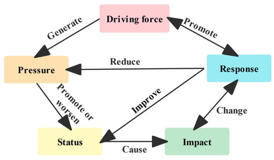 Driving Force–Pressure–State–Influence–Response (DPSIR) can systematically analyze the relationship between economic benefits and the impact on the ecological environment and has the characteristics of comprehensiveness, systematicity, integrity, and flexibility [31]. In this framework, driving force refers to human activities and processes [32]; pressure refers to social behavior and development that have a direct impact on the environment, economy, and society [33]; state reflects the status of the environment and natural resources, etc. [34]; impact refers to the measurement of environmental impact [35]; response refers to specific actions to reduce stress and impact [36]. This model has been popularized by scholars for ecological effect evaluation [37,38,39], water resource security evaluation [40,41], water environment coordination [42,43], and tourism ecological health evaluation [44,45]. The specific logic structure is shown in Figure 2 below.
