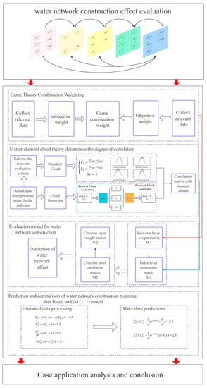 To sum up, the specific flow of the water network construction effect evaluation based on the game-weighting matter-element cloud model used in this paper is shown in Figure 3 below.