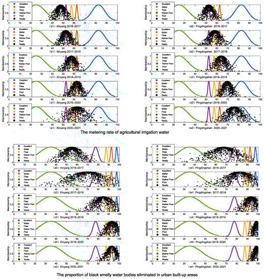 Using the evaluation index level standard cloud in Table 4 as the domain, using the matter-element cloud evaluation model for the effectiveness of water network construction, MATLAB 9.4 (R2018a) software was used to calculate the correlation degree of water network construction evaluation indicators in Xinyang City and Pingdingshan City from 2016 to 2017, from 2017 to 2018, from 2018 to 2019, from 2019 to 2020, and from 2020 to 2021. The proportion of black and odorous water elimination in urban built-up areas and the measurement rate of agricultural irrigation water were selected as examples, as shown in Figure 4. Black represents real data, indicating that the selected indicators are constantly approaching the excellent.