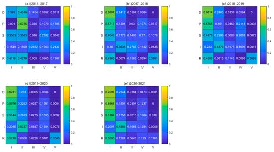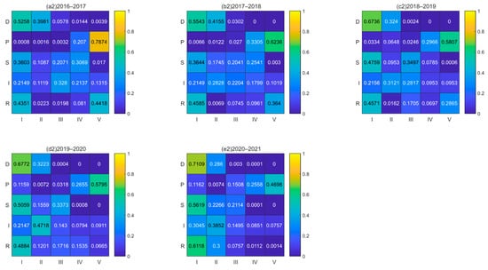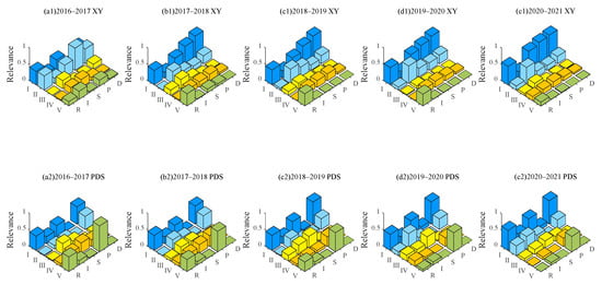 After coupling the degree of correlation with the weight, the evaluation results of the criterion layer index for the effect of water network construction in 2016–2017, 2017–2018, 2018–2019, 2019–2020, and 2020–2021 are calculated, as shown in Figure 5 and Figure 6.