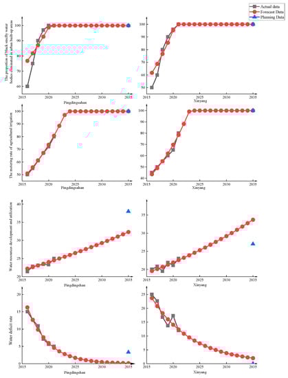 The prediction of the effect of planning implementation is part of the evaluation of the effect of water network construction. It is helpful to understand the changing trend of the construction effect level of the water network construction area in the future and then take corresponding improvement measures in a targeted manner to ensure the effective implementation of planning data. This paper uses the GM(1,1) model to fit the data of Xinyang City and Pingdingshan City from 2016 to 2021 according to the Formulas (11)–(17) and compares them with the planning data of the local water network construction in 2035 and selects the urban built-up area to eliminate black and odorous water bodies. The proportion, the metering rate of agricultural irrigation water, the development and utilization of water resources, and the water shortage rate indicators are used as examples to make a fitting graph, as shown in Figure 8.