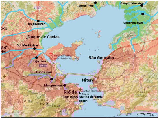 Guanabara Bay (Figure 1) lies along the northern coast of Rio de Janeiro, the second largest city in Brazil and home to one of largest urban populations in the world []. The Guanabara Bay drainage basin receives most liquid effluents produced from the greater metropolitan area of Rio de Janeiro, one of the most industrialized coastal areas of Brazil. Of the 11.8 million inhabitants in the Rio de Janeiro City metropolitan area, 70% are located within the Guanabara Bay drainage basin [].