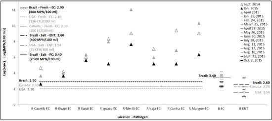 In Brazil, both fecal coliforms and E. coli are used as indicators for freshwater, in addition to enterococci for saltwater []. The Brazilian National Environmental Council (CONAMA) recommends that fecal coliforms, E. coli, and enterococci be used as indicators for recreational contact standards. Upper limits have been established of 1000 CFU/100 mL for fecal coliforms, 800 CFU/100 mL for E. coli, and 100 CFU/100 mL for enterococci which apply to fresh, brackish, and salt water [,,]. Concentrations must be below these values for five consecutive days in order for the water to be classified as satisfactory.