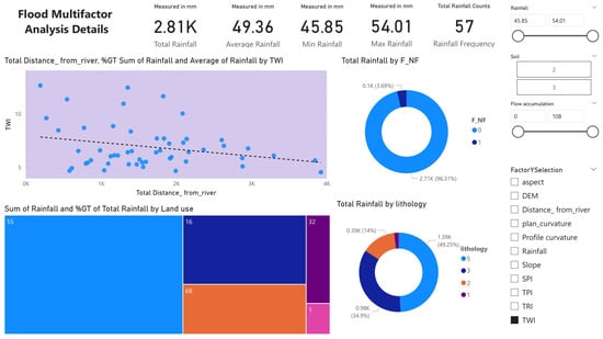 Figure 3 illustrates the correlation plot for the sum of rainfall and the average sum of rainfall. The majority of data points lie near the correlation line. This figure considers two main classes, i.e., flood and non-flood and total rainfall affected by lithology. Flood and non-flood are further divided into two sub-classes. The contribution of each class is illustrated in the doughnut chart. Similarly, four sub-classes of lithology, and the contribution of each class, are represented in the doughnut chart. These graphs are drawn by keeping TWI as a Y factor and the flow accumulation from 0 to 180.