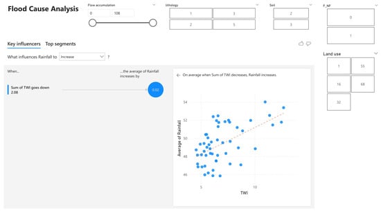 The correlation plot in Figure 5 represents the average sum of rainfall with respect to TWI and all the participating classes. The graph shows the clusters resulting when the sum of TWI decreases, with the rain tending to increase. Furthermore, for the given scenario, the sum of TWI decreased to 2.08. The flow accumulation was the same as that in the previous graph.