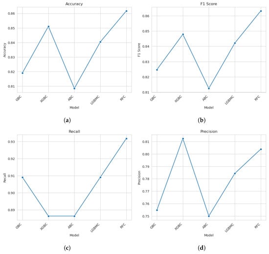 Contribution of the Selected Machine Learning Algorithms in the Overall Performance Evaluation: Graphical Representation and Comparative Analysis in terms of (a) Accuracy, (b) F1 Score, (c) Recall and (d) Precision.