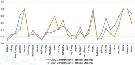 The primary reference for evaluating the effectiveness of urban flooding governance in China was the comprehensive technical efficiency value in the DEA model, which reflects whether the inputs and outputs of various government departments in urban flooding governance have reached an overall relatively effective level. When the comprehensive technical efficiency value is 1, urban flooding disaster governance is effective, and vice versa; the closer the value is to 1, the higher the efficiency of urban flooding disaster governance. As seen from Table 3, the comprehensive technical efficiency of urban flooding disaster governance in China was 0.464 in 2012, and it declined to 0.408 in 2021, showing that the overall efficiency was not high, indicating that urban flooding disaster governance in China has not reached the optimal input–output scale and that there is still much room for improvement. In light of Figure 1, a comparative analysis of the efficiency of urban flooding disaster governance in China’s provincial capitals shows that the provincial capitals with effective urban flooding disaster governance in 2012 were Hohhot, Haikou, Xining, and Yinchuan, and that the comprehensive technical efficiency of Hohhot, Xining, and Yinchuan was still on the production frontier in 2021. Other provincial capitals were relatively ineffective in governing urban flooding hazards, but their governance efficiency varied widely.