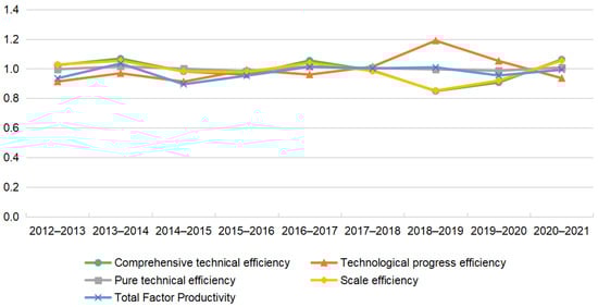 From 2012 to 2021, the average value of the technological progress efficiency of urban flooding disaster governance was 0.990, with an average annual reduction of 1%. The technological progress efficiency value for urban flooding disaster governance was the smallest in 2014–2015 (0.912) and the largest in 2018–2019 (1.189), experiencing significant fluctuation. The technological progress efficiency values for 2012–2017 and 2020–2021 were both less than 1, indicating that urban flooding disaster governance was in a state of technological decline in the above years. From 2017 to 2020, the technical progress efficiency of urban flooding disaster governance reached a value greater than 1, indicating that flooding disaster governance was subject to greater technical support during this period. This aligns with the government’s work report in March 2017, which proposed to “launch a three-year action to eliminate key flood-prone sections of urban areas and promote the construction of sponge cities” [], resulting in urban flooding disaster governance experiencing a stage of technical progress. Hence, urban flooding disaster governance showed a phase of technological progress during this period.