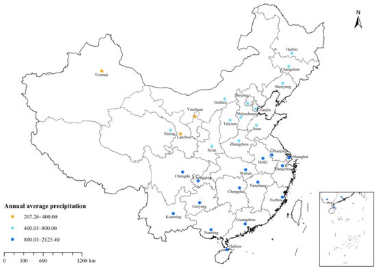 Precipitation is one of the causes of urban flooding, and it is also an important basis for government departments to prevent urban flooding and plan the direction of financial investment. Therefore, based on the average annual precipitation of China’s provincial capitals from 2012 to 2021, the 30 provincial capitals were divided into three groups of urban agglomerations with 400 mm annual precipitation and 800 mm annual precipitation as the boundary (Figure 3). The total factor productivity index and its decomposition results are shown in Table 6.