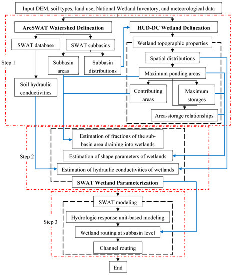 A joint modeling framework was proposed by coupling HUD-DC and SWAT to enhance watershed hydrologic modeling under the influence of wetlands. In the framework, HUD-DC was utilized to delineate wetlands and identify their topographic properties (including their spatial distribution, maximum ponding areas, maximum storage, and contributing areas), while ArcSWAT was used for delineating subbasins. A new method was developed to estimate the wetland-related parameters in the SWAT wetland module and enhance the subbasin-level wetland modeling in the semi-distributed SWAT model.