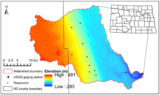 The Land Use and Land Cover data presented in this study are openly available in National Land Cover Database (NLCD) 2019 Products at https://doi.org/10.5066/P9KZCM54 (accessed on 7 June 2022) [46]. The DEM data analyzed in this study are available at the USGS National Map (https://www.usgs.gov/tools/national-map-viewer (accessed on 7 June 2022). The soil data analyzed in this study are available at the Soil Survey Geographic (SSURGO) Database (http://websoilsurvey.nrcs.usda.gov/(accessed on 7 June 2022). The meteorological data analyzed in this study are available at the Parameter-elevation Regressions on Independent Slopes Model (PRISM; https://prism.oregonstate.edu (accessed on 6 June 2022) and the Prediction Of Worldwide Energy Resources (POWER) Data Access Viewer (https://power.larc.nasa.gov/(accessed on 6 June 2022). The wetland data analyzed in this study are available at the National Wetlands Inventory (https://data.nal.usda.gov/dataset/national-wetlands-inventory (accessed on 15 July 2022). The discharge data analyzed in this study are available at the USGS National Water Information System (http://waterdata.usgs.gov/nwis/(accessed on 26 July 2022). The reservoir data analyzed in this study were obtained from the North Dakota Department of Water Resources (NDDWR) and are available from the authors with the permission of NDDWR. The data generated during this study are available from the authors.