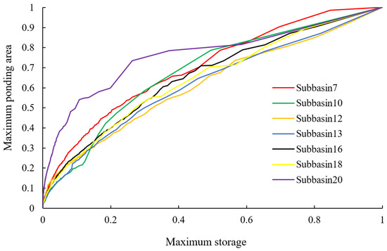 Normalized area–storage relationships of real individual wetlands for the selected subbasins.