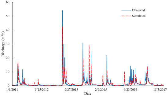 Figure 5 shows the comparison of the hydrographs simulated by the joint model against the observed data. Its performance was evaluated by using two statistical metrics for both calibration and validation periods (Table 5). The NSE values are 0.82 for the calibration period and 0.61 for the validation period and the PBIAS values are 5.01% for the calibration period and 6.50% for the validation period, indicating that the model performance is “very good” in the calibration period and “satisfactory” in the validation period [54]. In the entire simulation period (2011–2017), the UTR watershed received an average annual precipitation of 582.7 mm, which generated 84.9 mm surface runoff. The average annual evapotranspiration, as the major loss term of the watershed, was 493.8 mm. In addition, 76.2 mm water flowed out of the watershed through its outlet. On average, surface runoff contributed 74% of the streamflow, while the remaining 26% of the streamflow came from baseflow. Figure 5 shows slight underestimations, especially for the early spring peaks induced by snowmelt in some years (e.g., 2013, 2014, and 2017), which can be attributed to the limited capability of SWAT in simulating complex hydrologic processes in cold regions. Similar issues were also observed by Tahmasebi Nasab et al. [55], Zeng et al. [30], and Shabani et al. [49] in their SWAT applications. The model’s performance was also affected by the lumped methods (e.g., SCS-CN) in the daily SWAT modeling [56] and the simplifications in the semi-distributed, watershed-scale model [41].