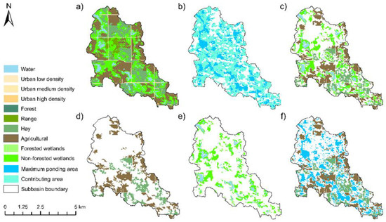 Land use and land cover (LULC) of subbasin 12: (a) reclassified LULC; (b) identified maximum ponding areas of wetlands and the corresponding contributing areas; (c) LULC used for hydrologic response unit (HRU) definition; (d) agricultural land and hay from the used LULC; (e) water and wetlands from LULC; and (f) agricultural land and hay from the used LULC and identified ponding areas.