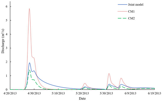 Figure 7 shows the simulated hydrographs of subbasin 12 from April to June 2013. Compared with the joint model, significant overestimation in CM1 and underestimation in CM2 were observed. The overestimation in CM1 can be attributed to the lack of wetland routing and the smaller wetland-related areas than the identified ponding and contributing areas in the joint model (Table 6). In CM1, the area of wetlands and water extracted from the LULC map (Figure 6e) accounted for 22.56% of the area of subbasin 12, and the corresponding HRUs defined in CM1 accounted for 45.05%. However, in the joint model, the maximum ponding area and its corresponding area accounted for 71.23%, indicating a much higher wetland-related area. In addition, both CM1 and CM2 showed a steeper recession (Figure 7). This is likely due to a failure to account for the influences of smaller individual wetlands, such as retention and hierarchical release of the ponded water in their wetland parameterization. Similar findings on the impacts of smaller wetlands were emphasized by Zeng et al. [30] in their study involving the comparison between a wetland-enhanced SWAT model and the original SWAT model.