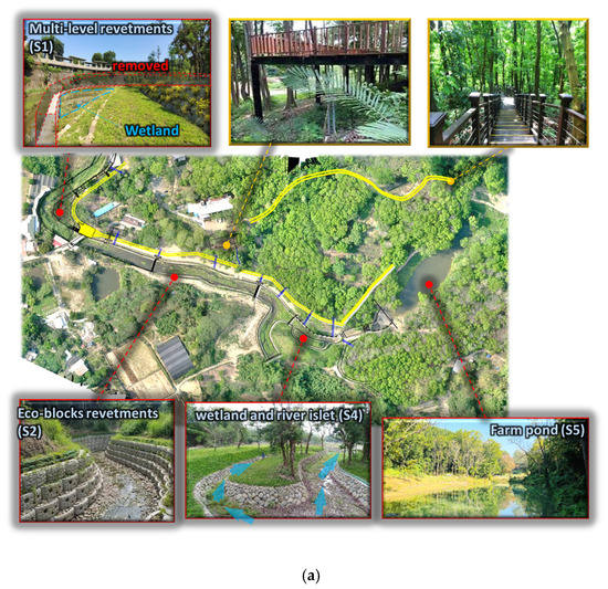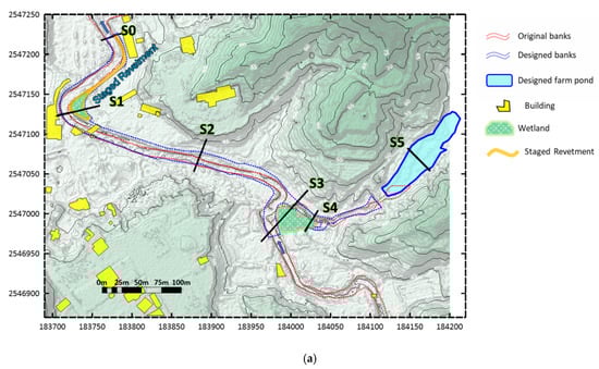 Moreover, the flooded space of the river should be significantly increased. Hydraulic modeling planning (Section 3) widened the original mainstream from 6 to 12 m (as in S2 in Figure 8a,b). This design can reduce the flow velocity and lower the risk of scouring the bank and revetment damage. Two types of revetments that belong to ecological methods were used. Stone revetments were used instead of high and vertical concrete dikes, and the pores among the stones facilitate creature habitat and plant growth. In the downstream reach of the confluence, the front yard section of the Sin-Hua Forest, eco-pervious blocks were constructed as another type of ecological revetments. Precast concrete could reduce on-site construction and dust; soil and stones were filled in the hollow parts for planting as integration of gray-green engineering. The river revetments were designed with a mild side slope to enhance the landscape quality.
