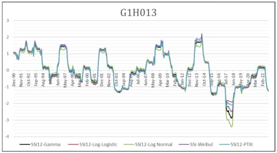 SSI12 results for G1H013 Streamflow time series computed using Gamma, Log-Logistic, Log-Normal, PTIII, and Weibull Probability Distribution Functions.