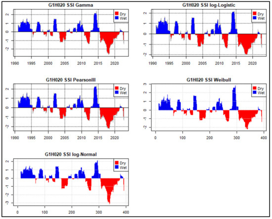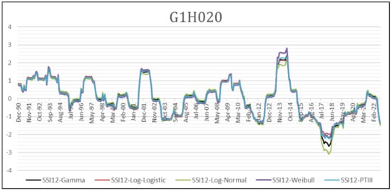 SSI12 results for G1H020 streamflow time series computed using Gamma, Log-Logistic, Log-Normal, PTIII, and Weibull Probability Distribution Functions.