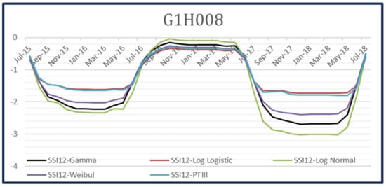 The results of the SSI calculation using the Gamma, Log-Logistic, Log-Normal, PTIII, and Weibull PDFs are shown in Figure 4, Figure 5 and Figure 6. In Figure 4 (G1H008), it can be observed that the SSI12 time series computed using the Gamma, Log-Logistic, Log-Normal, PTIII, and Weibull PDFs produced drought events with similar onset and end times but with different intensities and magnitudes. As shown in Table 4, between November 2004 and June 2005, the SSI12 computed using Gamma, Log-Normal, and Weibull PDFs produced severe (−1.6) drought conditions, while the SSI12 computed using Log-Logistic and PTIII PDFs produced moderate (−1.4) drought conditions. As shown in Table 5, between December 2015 and April 2016, the SSI12 computed using Gamma, Log-Normal, and Weibull PDFs produced extreme and severe (−2.2, −2.3, and −2.0, respectively) drought conditions, while the SSI12 computed using Log-Logistic and PTIII PDFs produced severe (−1.6) drought conditions.