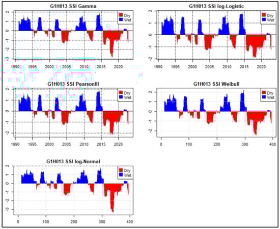 The SSI calculations for G1H008, G1H013, and G1H020 streamflow time series were carried out using the R software package. The SSI time series computation using the Gamma, Log-logistic, and PTIII PDFs was carried out in R-Studio software using the SPEI version 1.7 package. The manual for the SPEI version 1.7 package was obtained from https://cran.r-project.org/web/packages/SPEI/index.html (accessed on 9 January 2023). The SSI time series computation using Weibull and Log-Normal PDFs was carried out in R-Studio software using the SCI version 1.0–2 package. The manual for the SCI version 1.0–2 package was obtained from https://www.rdocumentation.org/packages/SCI/versions/1.0-2 (accessed on 9 January 2023).