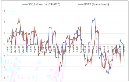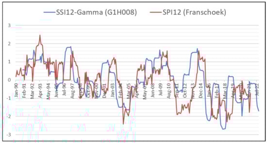 The credibility of the SSI12 time series obtained using both the Gamma, Lo-Logistic, PTIII, Log-Normal, and Weibull PDFs was tested by comparing it with an SPI12 time series obtained using the Gamma PDF for both the Franschoek and Stellenbosch stations. As shown in Figure 11, the Comparison between the SPI12 time series for Franschoek and the SPI12 time series for Stellenbosch reveals that both SPI time series are closely similar. Hence, since Franschoek is located within the BRC, the Franschoek SPI 12 time series was used to test the credibility of the SSI12 for G1H008, G1H013, and G1H020. The SSI12 time series for G1H008, G1H013, and G1H020 computed using the Gamma PDF were used for comparisons with the SPI 12 for Franschoek. For instance, both the SSI12 and SPI 12 identify the extreme drought conditions that occurred during the 2015–2018 period.