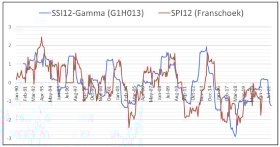 Comparison between SPI12 time series for Franschoek and SSI12 time series for G1H013.