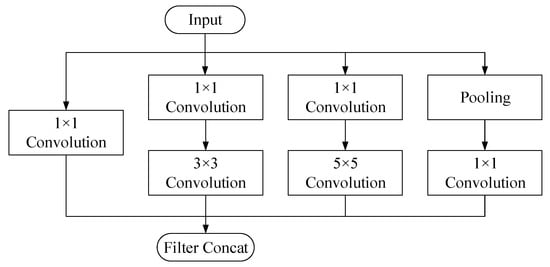 Inception [] is also a deep learning network based on CNN networks and it solves the problem of excessive stacking parameters in multiple convolutional layers, transforming the network from deeper to wider. The Inception network designs a network with an excellent local topological structure, which performs multiple convolution or pooling operations on the input tensor in parallel and concatenates all output results into a very broad feature map. Inception networks typically consist of several Inception modules connected in series. Figure 2 illustrates the structure of the classical Inception module, which passes the input tensors through the layer that 1 × 1 convolution, 1 × 1 and 3 × 3 convolutions, 1 × 1 and 3 × 3 convolutions, pooling layer and 1 × 1 convolution, and concatenates the above calculation results into the output.