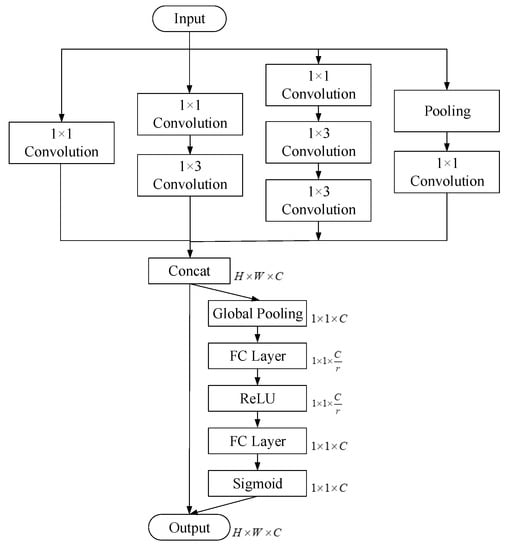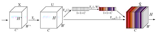 The structure of the SE (squeeze and excitation) module [] is shown in Figure 3. The SE blocks can be thought of as an attention function that is used for any given transformation . In deep learning, is usually a convolutional operator. Input tensor is transformed to by .