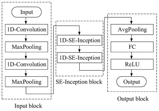 The second part consists of two 1D-SE-Inception blocks. SE blocks are added to the Inception block to assign weights to different information and suppress redundant information, thus improving the model’s ability to extract spectral features. The superposition of two 1D-SE-Inceptions increased the depth of the network, allowing it to fully extract network features and achieve a balance between accuracy and complexity.