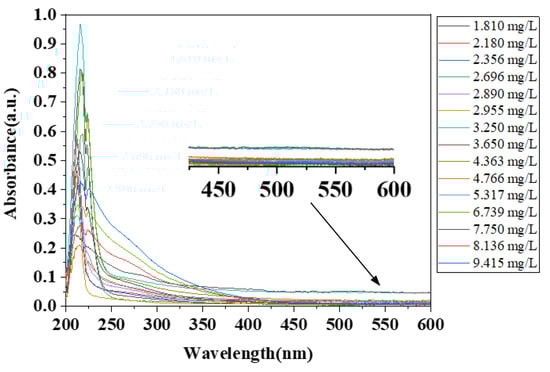The UV-VIS absorption spectra of 390 samples with different TOC concentrations in different regions from 2019 to 2023 were measured experimentally. Due to limited space, only some spectra of the samples were plotted, as shown in Figure 6.