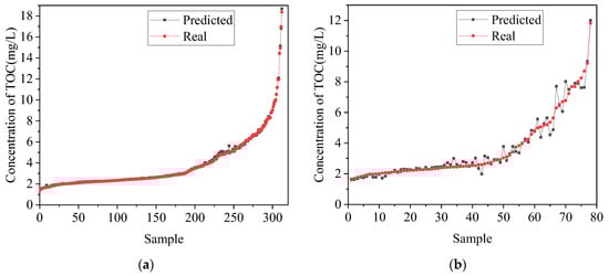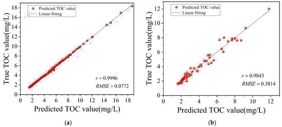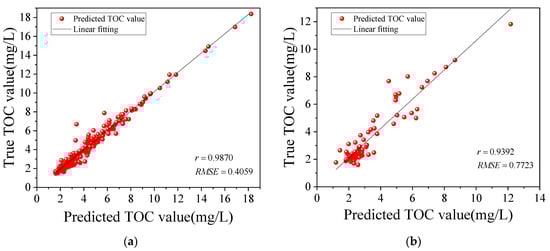 A comparison between the predicted and true values in the train set and test set of the water samples of the best detection model is shown in Figure 7. The abscissa in the figure is the sample number and the ordinate is the TOC concentration value. The errors between the predicted values and the true values in both the train and test sets are relatively small. Few samples have significant errors due to the complexity of the real water and the diversity of the water composition. Specifically, the number of samples taken close to the samples with large errors was small, or there may have been confounding factors, such as rainwater and sewage discharge prior to sampling, which resulted in significant differences between the types of organic matter in the water body and traditional water bodies, leading to slightly larger detection errors. The relationship of the predicted and true TOC in the train set is plotted in Figure 8a. The correlation coefficient r = 0.9996 and RMSE = 0.0772 indicated that the 1D-SE-Inception V2 network almost reduced the whole deviation in the train set.