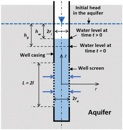 A slug test consists of estimating the hydraulic conductivity from observations of the recovery of the water level in a well after a sudden removal or injection of a small amount of water. There is no exact mathematical solution to this problem, but it is generally accepted that, ignoring the elastic storage in the aquifer, the head difference in the well decays exponentially with time, as proposed by Hvorslev [] and Bouwer and Rice [] as follows: