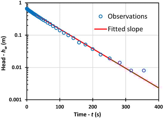 To demonstrate the usefulness of the methodology, it was applied to a practical test case taken from Butler []. The test case consisted of a falling head slug test conducted in a monitoring well, Well 4-2 in Pratt County Monitoring Site 36, Kansas, U.S. The aquifer is unconfined and consists mainly of unconsolidated alluvial deposits of sand and gravel with interbedded clay. At the well site, the aquifer is 47.87 m thick. The top of the well filter section is located at a depth of 16.77 m below the static water level. The well has an inner radius ri = 0.064 m, an outer radius ro = 0.125 m, and a length L = 1.52 m. The initial head displacement in the well was h0 = 0.671 m and the difference in head hw was monitored for about 6 min. The observations against time are shown in Figure 3.