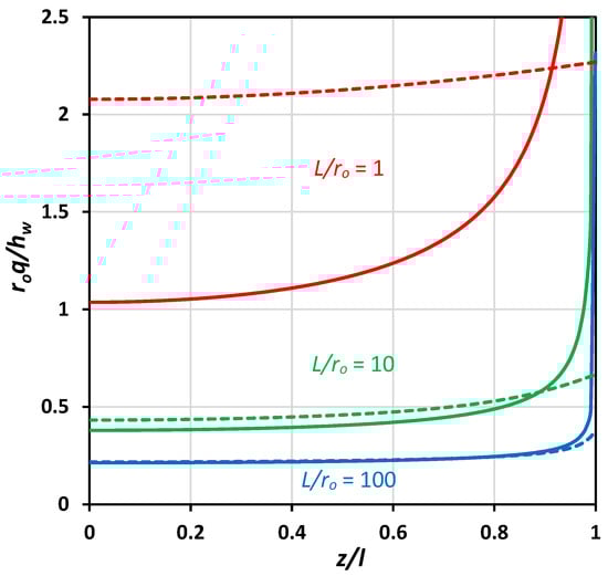 The accuracy of the approximate analytical solution also depends on deriving the shape factor by averaging the local shape factors instead of using the average specific flux. The error introduced by this assumption depends on the degree of uniformity of the specific flux along the well screen and will be small if the flux distribution is more uniform. Figure 5 shows a plot of against derived with the numerical solution, Equation (17) (solid lines), and with the approximate analytical solution, Equation (22) (dotted lines), for the screen aspect ratios equal to 1, 10, and 100, respectively. Similar derivations of flux distributions along the screen have been presented in other studies [,,,,,,,]. The flux derived with the asymptotic approximation appears to be fairly uniform along the screen, while the flux derived with the numerical solution is less uniform, especially for small aspect ratios, and tends to infinity at the edges of the screen (). It seems that for the screen ratio going to infinity, the flux becomes completely uniform with Dirac peaks at the edges. The physical explanation for this is that the flux vector must be perpendicular to the screen because the screen forms an iso-potential surface but must be parallel to the impermeable casing of the well outside the screen, resulting in a singularity at the edges of the screen with an infinite flux vector. This singularity is probably one of the reasons that an exact analytical solution is difficult to obtain and also represents a major obstacle to the accurate modelling of groundwater flow using numerical techniques, which has often been overlooked in the literature, e.g., [,,,,].