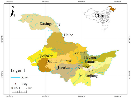 The study area, Heilongjiang Province, is located in an alpine region with a long winter time span and geographical coordinates: 121°11′~135°05′ E and 43°25′~53°33′ N, see Figure 1. As one of the important commodity grain bases in China, its grain production has been growing continuously since 2003 and will increase nearly threefold to 7.54×107 tons in 2020. At the same time, agricultural water consumption and arable land area also continued to grow, increasing by 1.85 times and 1.74 times, respectively, at the peak. Although the water consumption of CNY 10,000 output value fell by 3.99 × 102 m3, it was still nearly four times higher than the national data of the same period, and the water use efficiency was relatively low. The per capita cultivated land area of the province increased from 0.26 hm2 in 2003 to 0.54 hm2. Although the converted fertilizer use started to show a downward trend in 2015, it increased from 1.26 × 106 tons in 2003 to 2.24 × 106 tons in 2020, with an increase of 77.78%. Therefore, it is necessary to conduct research on the evolutionary trends and influencing factors of regional soil and water resource systems.