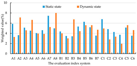 Determine the importance of each indicator by weight calculation method and screen out the main factors, which will affect the comprehensive benefits of land and water resources. The actual discrete data of each indicator are brought directly into the Equations (1) to (5) to determine the static importance of each indicator (). The basic data of each indicator under dynamic conditions are brought into Equations (1) to (5) to obtain the dynamic importance of each indicator (), see Figure 2.
