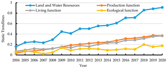 The static evolution time series diagram of the “Production–Life–Ecology” functions of land and water resources shows that the “Production–Life–Ecology” functions basically show a slow growth trend. The static evolution index of the production function increased continuously from 0.034 in 2004 to 0.37 in 2019, with a short decline in 2020, which is the largest index change among the land and water resource criterion layer, with a range of 0.34. The static evolution index of the life function increased continuously from 0.072 in 2004 to 0.36 in 2020, which is the largest index change among the land and water resource criterion layer, with a range of 0.29. The static evolution index of ecology function has a minimum of 0.025 in 2007 and a maximum of 0.20 in 2018 with some fluctuation, but it is the least variable index among the land and water resource criterion layer, with a range of 0.16.