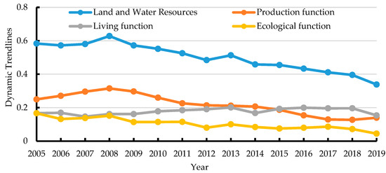From the dynamic evolution of the “Production–Life–Ecology” functions of land and water resources, we can see that the “Production–Life–Ecology” functions basically show a fluctuating downward trend. The dynamic evolution index of the production function fluctuates up from 2005 to 0.32 in 2008 and continues to decline to 0.13 in 2018, which is the largest change in the index of the land and water resource criterion layer, with a range of 0.19. The dynamic evolution index of life function fluctuates down from 2005 to 0.15 in 2007, and continues to rise to 0.20 in 2013, and fluctuates down to 0.15 in 2019. It fluctuates more frequently, but it is the least variable of the indices of the land and water resource guideline layer, which is only 0.05. The dynamic evolution index of ecological function fluctuates and decreases from a maximum of 0.17 in 2005 to 0.04 in 2019, showing an overall fluctuating downward trend. It is the larger index change among the land and water resource guideline layers, with a range of 0.12.